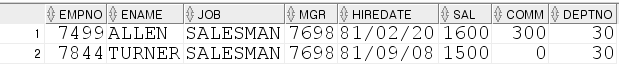 WHERE SAL >= 1500 AND JOB = 'SALESMAN';