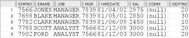 예를 들어 EMP 테이블에서 JOB이 'MANAGER'이거나 'ANALYST'인 직원의 정보를 가져오고 싶다면 다음과 같은 쿼리를