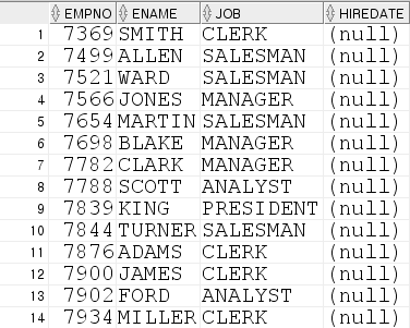 추가하려는 컬럼의 이름인 HIREDATE 다음에 데이터 타입인 DATE가 지정되어 있습니다.