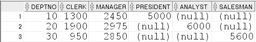SUM(DECODE(JOB,'SALESMAN',SAL)) SALESMAN