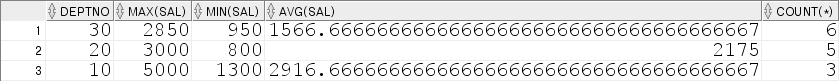 SELECT DEPTNO, MAX(SAL), MIN(SAL), AVG(SAL), COUNT(*)