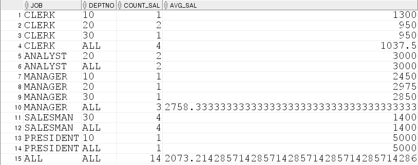 위 쿼리에서는 JOB과 DEPTNO에 대해 ROLLUP 연산자를 사용하여 총 5개의 그룹이 생성되며,