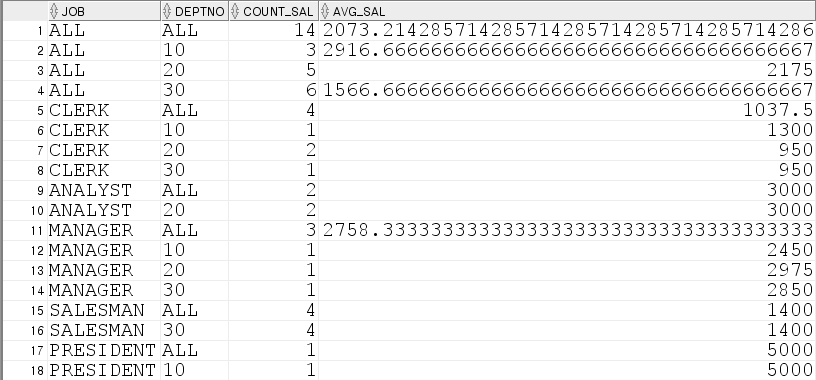 위 코드에서는 JOB과 DEPTNO에 대해 CUBE 연산자를 사용하여 총 9개의 그룹이 생성되며,